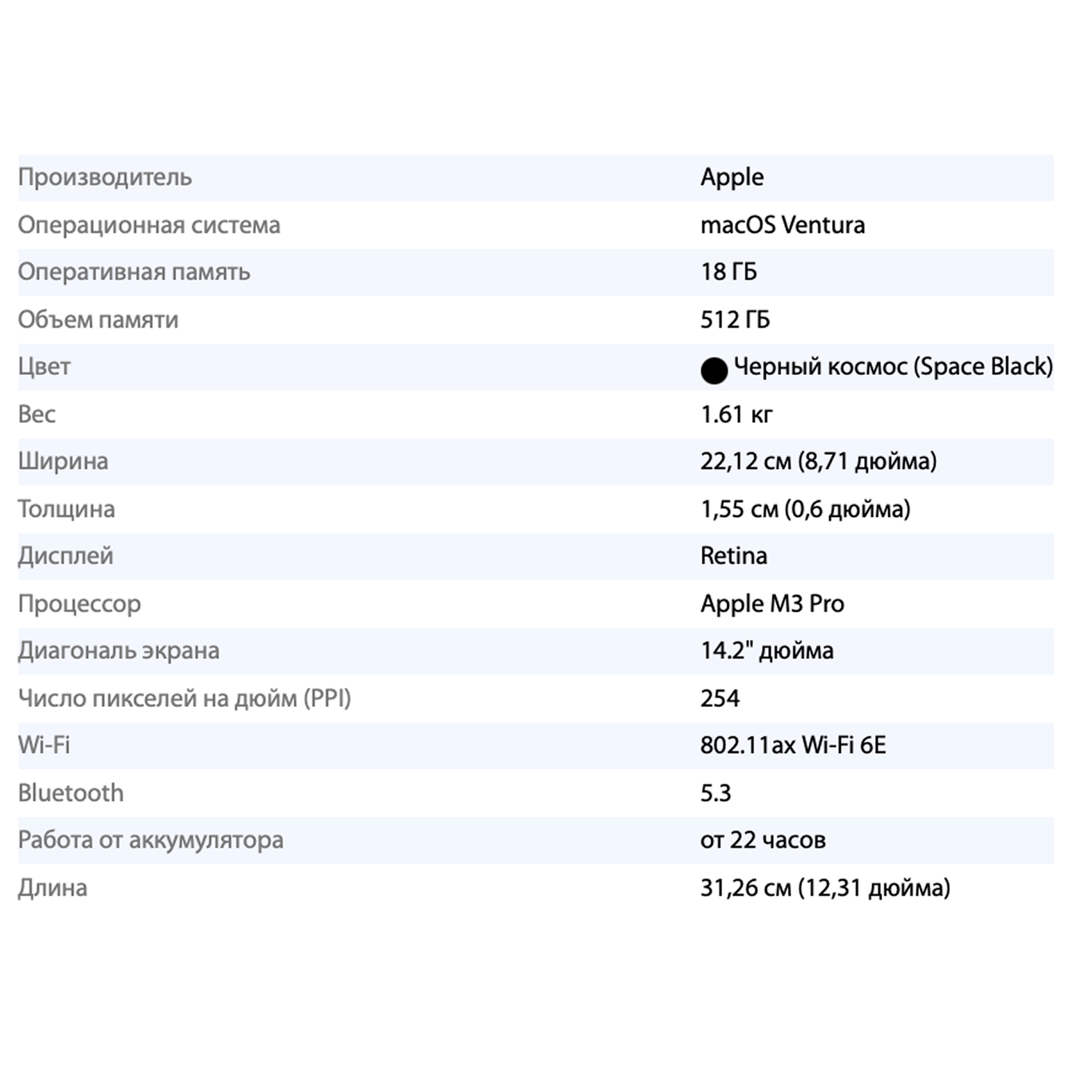 Будьте первым, кто оставил отзыв на “Ноутбук Apple MacBook Pro 14″ (M3 Pro 11-Core, GPU 14-Core, 18GB, 512GB) («Чёрный космос» | Space Black)”